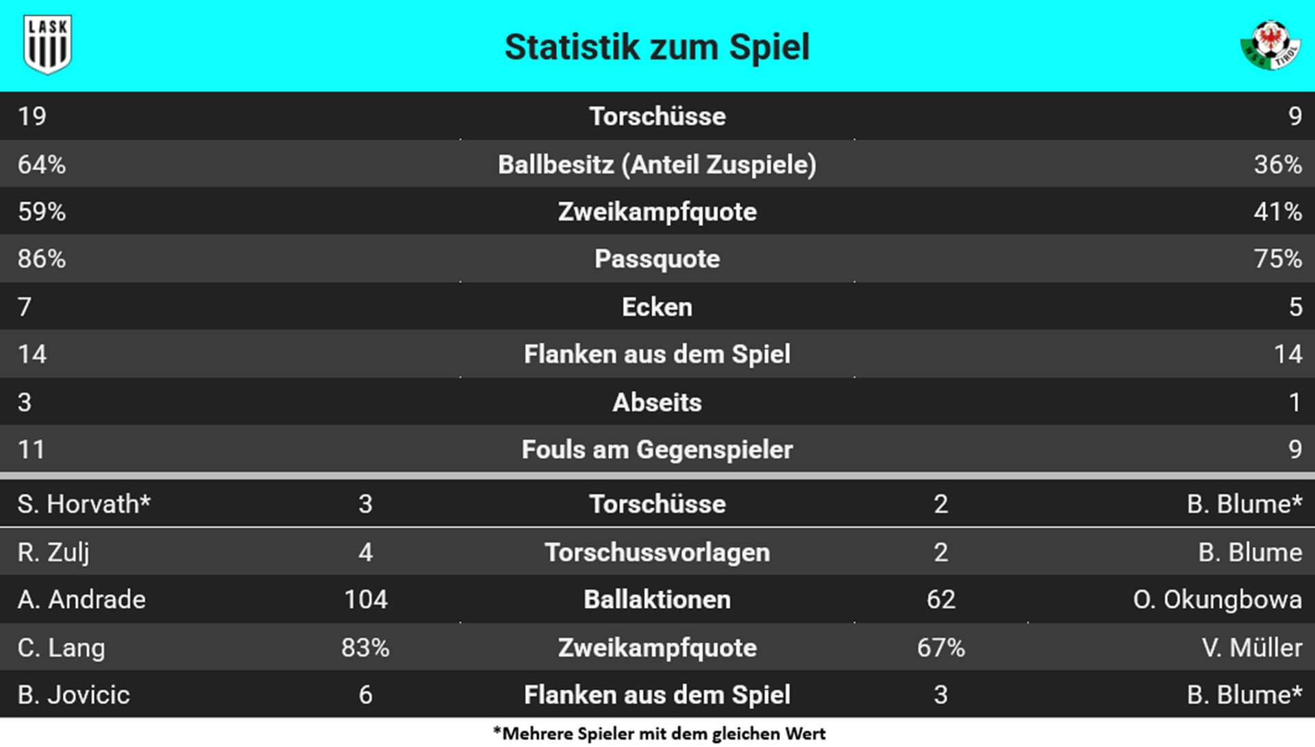 - Der LASK gewann sieben seiner letzten acht Spiele in der ADMIRAL Bundesliga und feierte dabei mehr Siege als in den ersten 18 Saisonspielen zusammen (6S). Der LASK feierte erstmals seit August 2022 unter Dietmar Kühbauer vier BL-Siege in Folge. Weiters blieb der LASK erstmals seit Oktober/November 2019 in vier BL-Spielen in Folge ohne Gegentor und gewann jedes dieser vier Spiele. Fünf Zu-Null-Siege in Folge gelangen dem LASK in der ADMIRAL Bundesliga zuletzt im Frühjahr 1985.