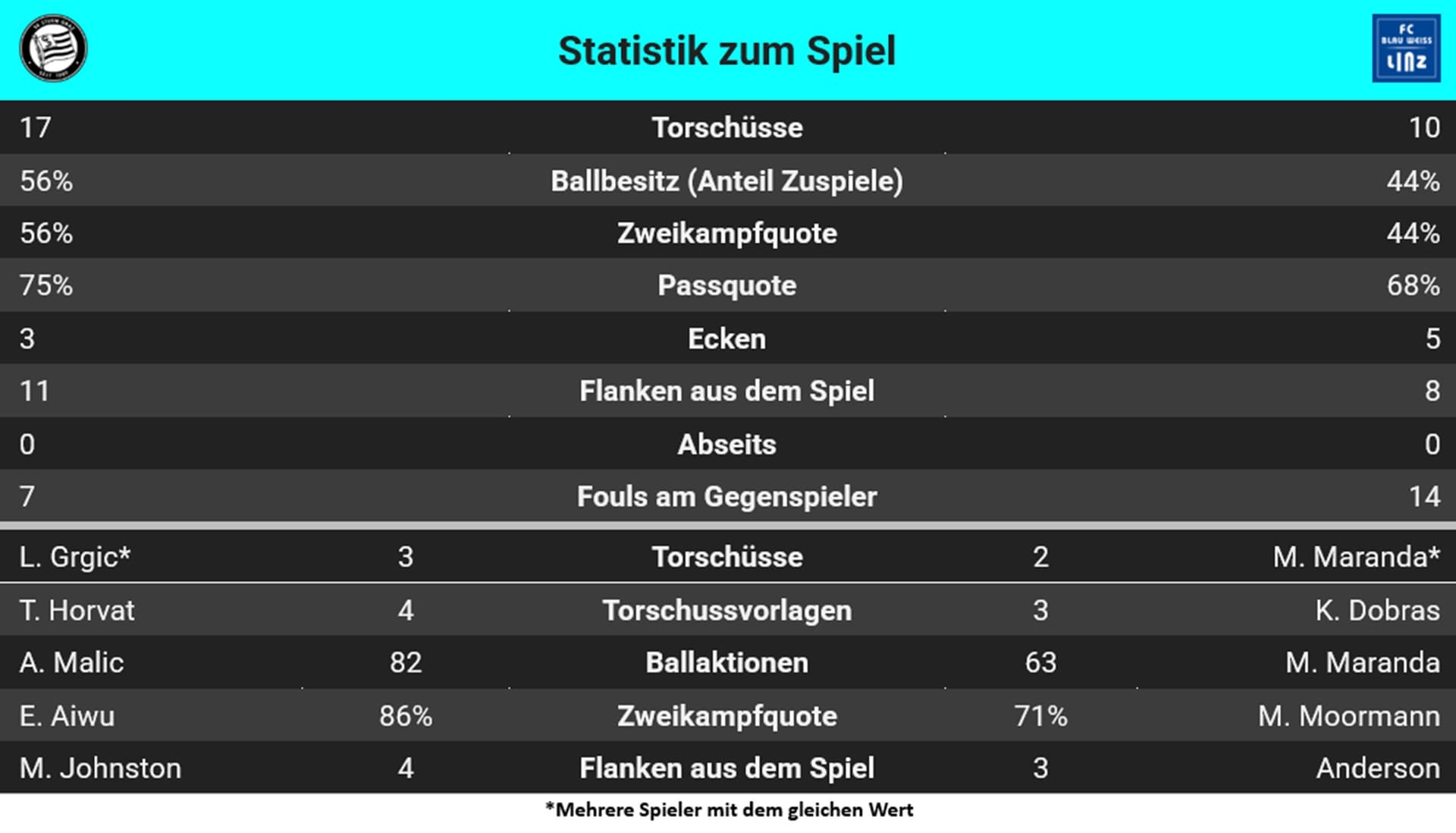 - Der FC Blau-Weiß Linz gewann in der ADMIRAL Bundesliga seine letzten zwei Spiele gegen den SK Rapid zu null – drei Siege in Folge gegen Rapid ohne ein Gegentor zu kassieren gelangen in der Bundesliga zuletzt dem FC Red Bull Salzburg im Jahr 2021.