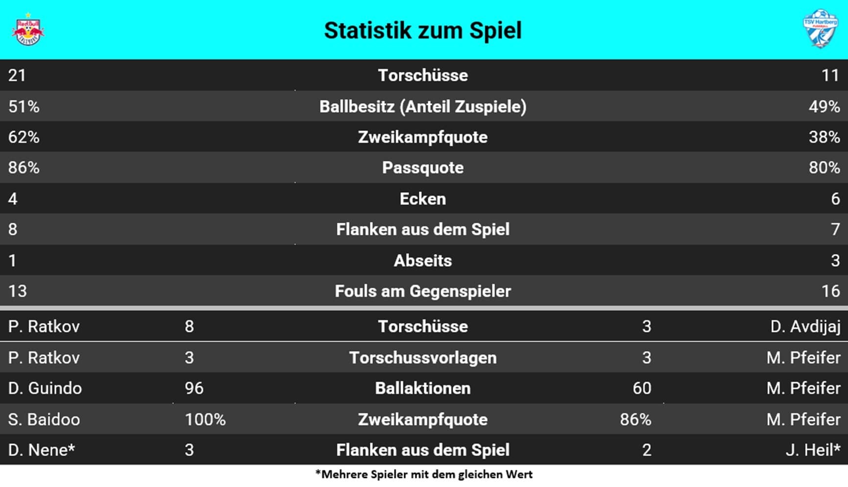 - Der FC Red Bull Salzburg ist gegen den TSV Egger Glas Hartberg in der ADMIRAL Bundesliga ungeschlagen und gewann 16 der 18 Duelle – kein anderes Team gewann 16 der ersten 18 BL-Duelle gegen einen Kontrahenten.