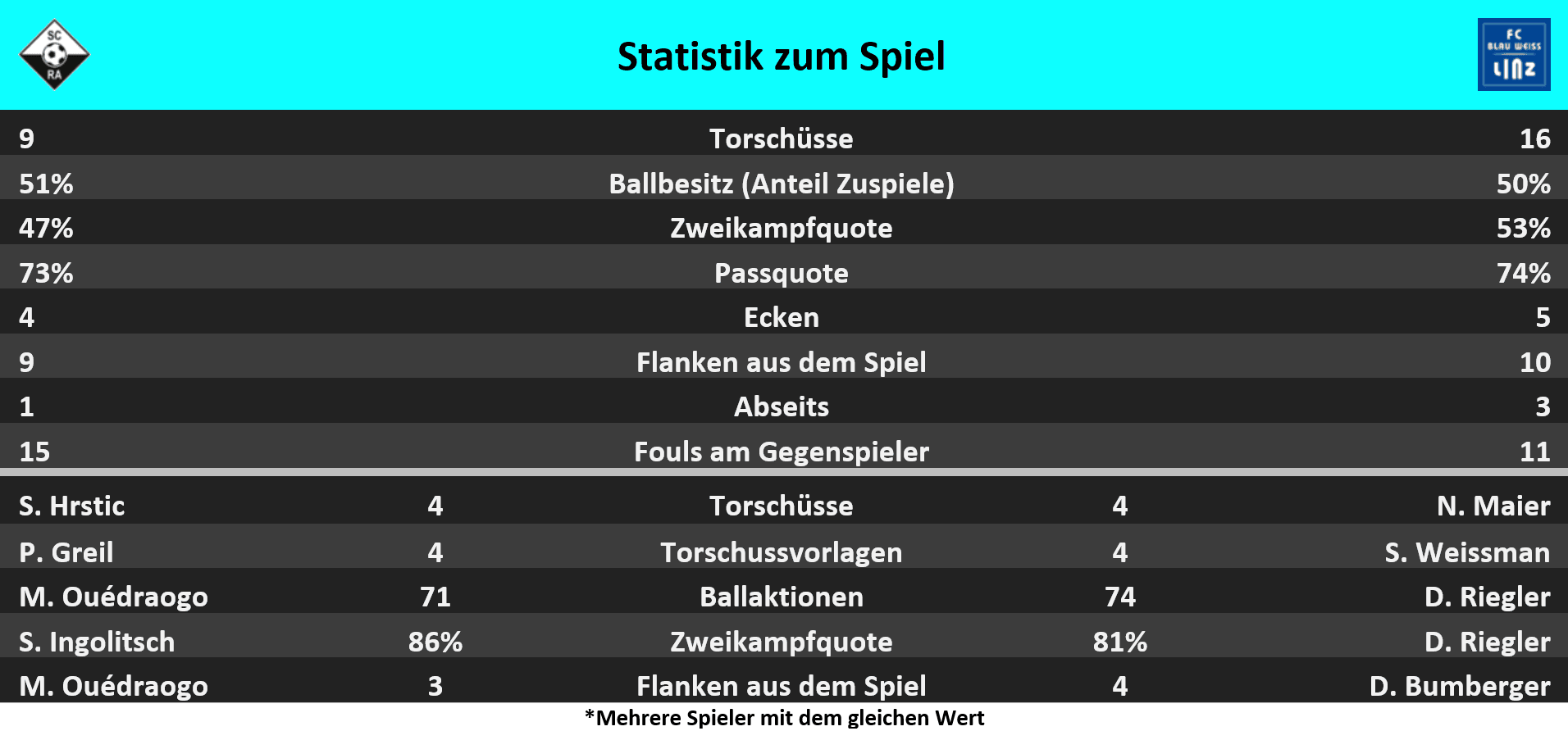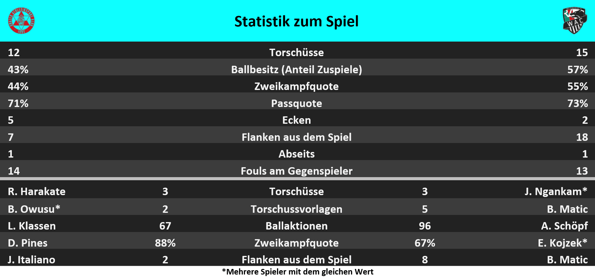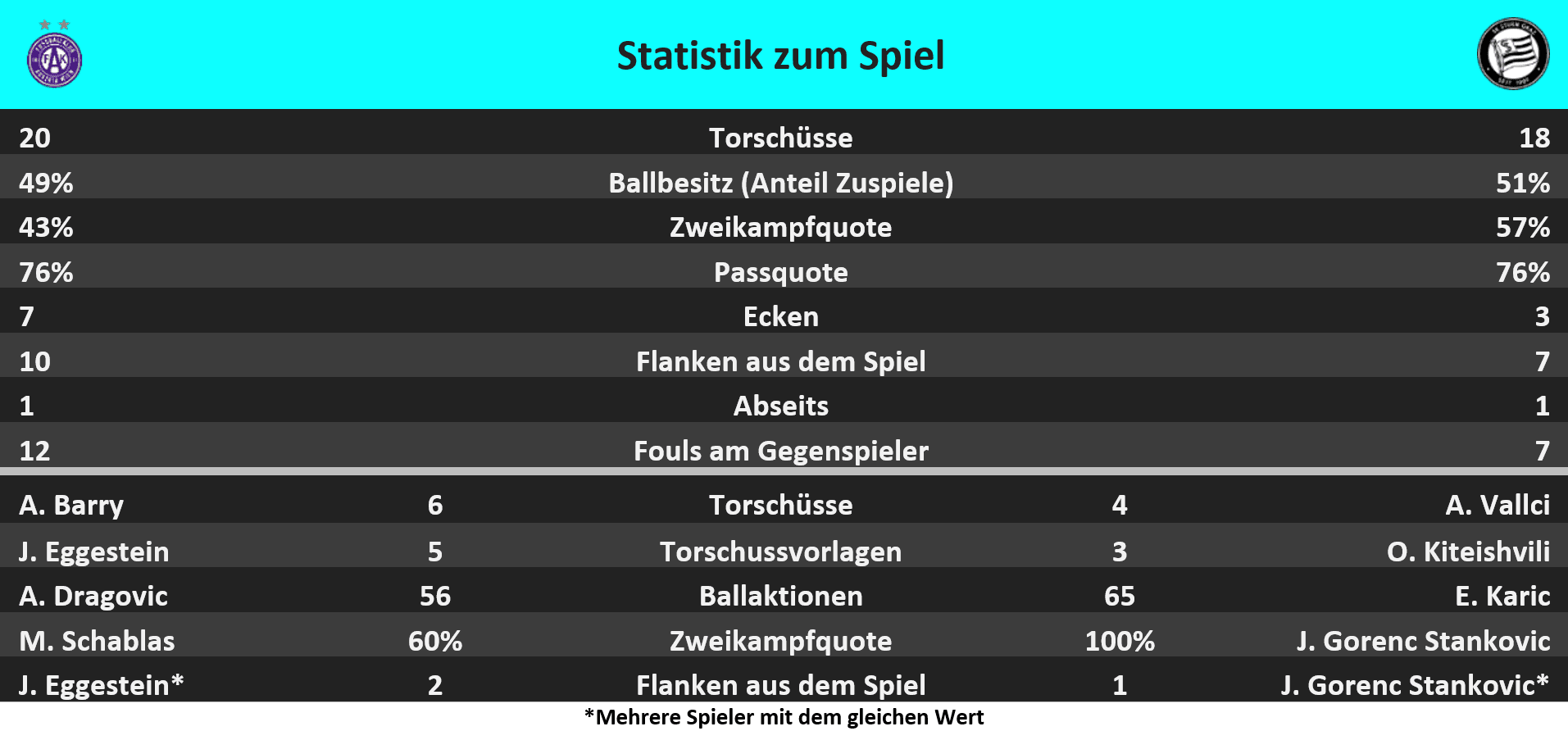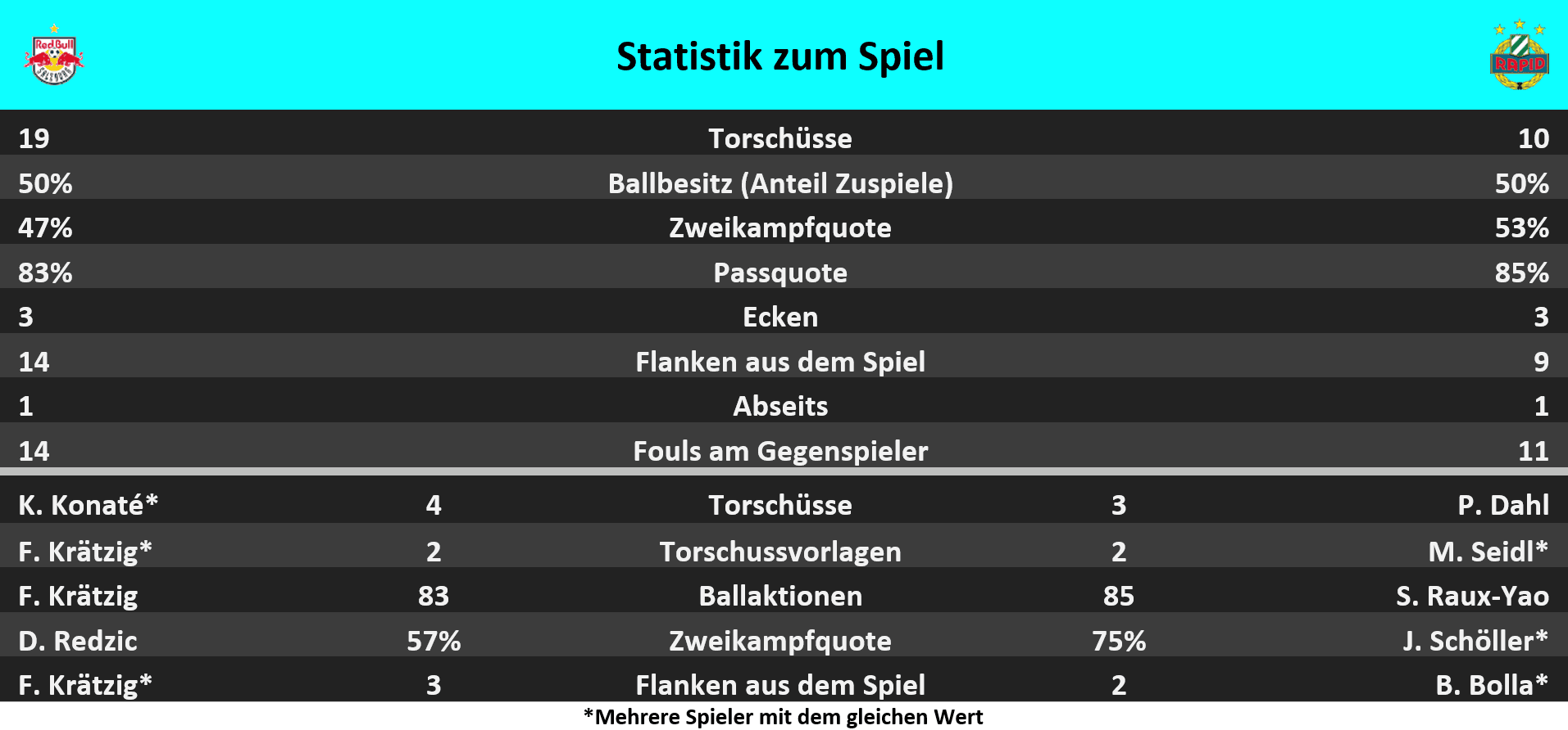 - Alessandro Schöpf hatte mit 96 Ballaktionen, 69 Pässen und 11 gewonnenen Zweikämpfen jeweils den Höchstwert in diesem Spiel der ADMIRAL Bundesliga.