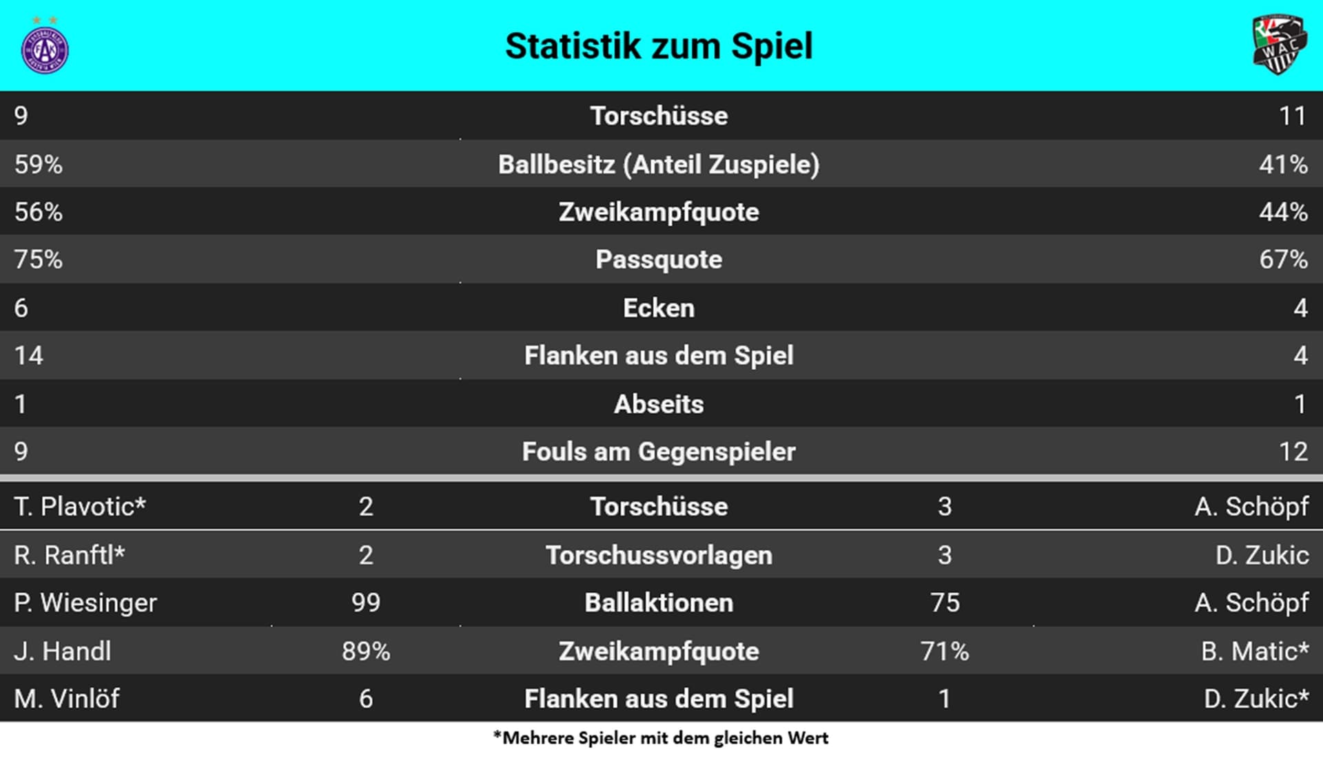 - Florian Wiegele parierte sieben gegnerische Schüsse – Höchstwert in dieser Runde der ADMIRAL Bundesliga und Bestwert eines Torhüters des Grazer AK 1902 in dieser BL-Saison.