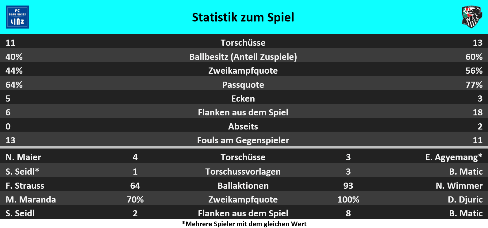- Der FC Blau-Weiß Linz traf erstmals in fünf Heimspielen in der ADMIRAL Bundesliga in Folge mehrfach. 11 Heimtore in der Gruppenphase sind Liga-Höchstwert.