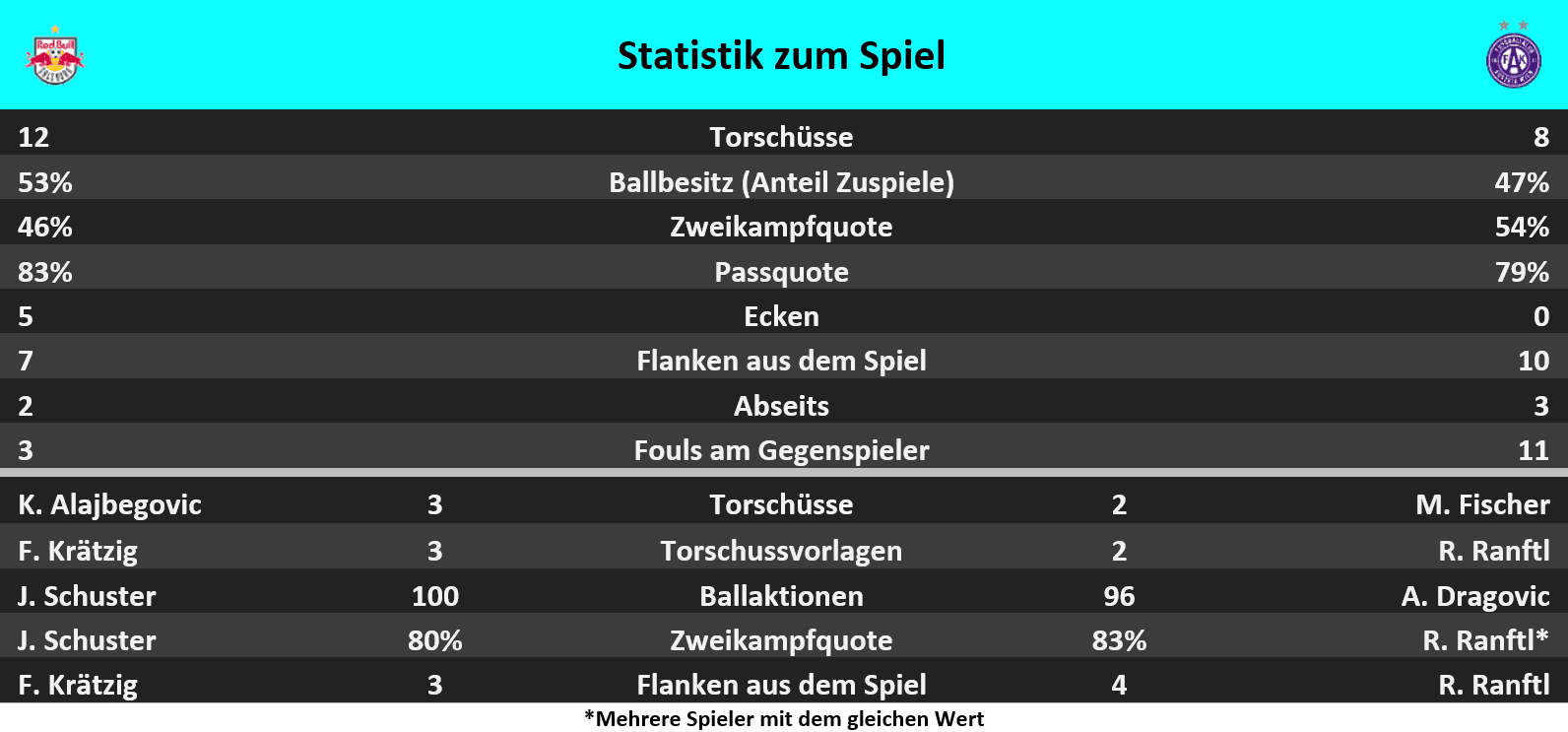 - Ante Bajic erzielte sein viertes Tor in dieser Saison der ADMIRAL Bundesliga, die letzten zwei davon gegen den Grazer AK 1902 – mehr Saisontore erzielte er noch nie gegen einen Gegner. Bajic gelangen zum dritten Mal in einem BL-Spiel Tor und Assist – jeweils in einem Heimspiel.