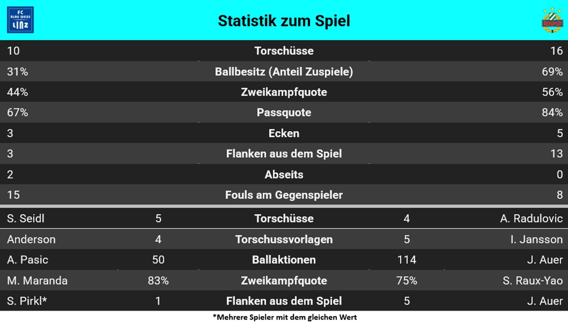 - Der FC Blau Weiß Linz gewann alle drei Duelle in dieser Saison der ADMIRAL Bundesliga gegen den SK Rapid. Die ersten drei BL-Duelle einer Saison gegen Rapid zu gewinnen gelang zuletzt dem SK Puntigamer Sturm Graz in der Saison 2022/23. Alle vier BL-Duelle gegen Rapid in einer Saison zu gewinnen gelang zuletzt dem FC Red Bull Salzburg in der Saison 2021/22.