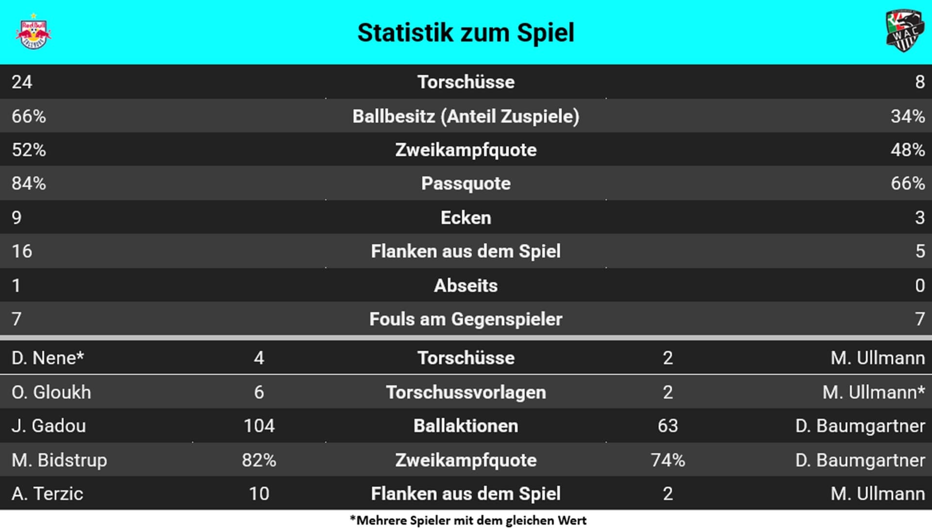 - Der FC Red Bull Salzburg ist in der ADMIRAL Bundesliga seit neun Auswärtsspielen beim RZ Pellets WAC ungeschlagen und gewann sieben davon – so lange ungeschlagen beim WAC blieb kein anderes Team in der BL-Historie.
